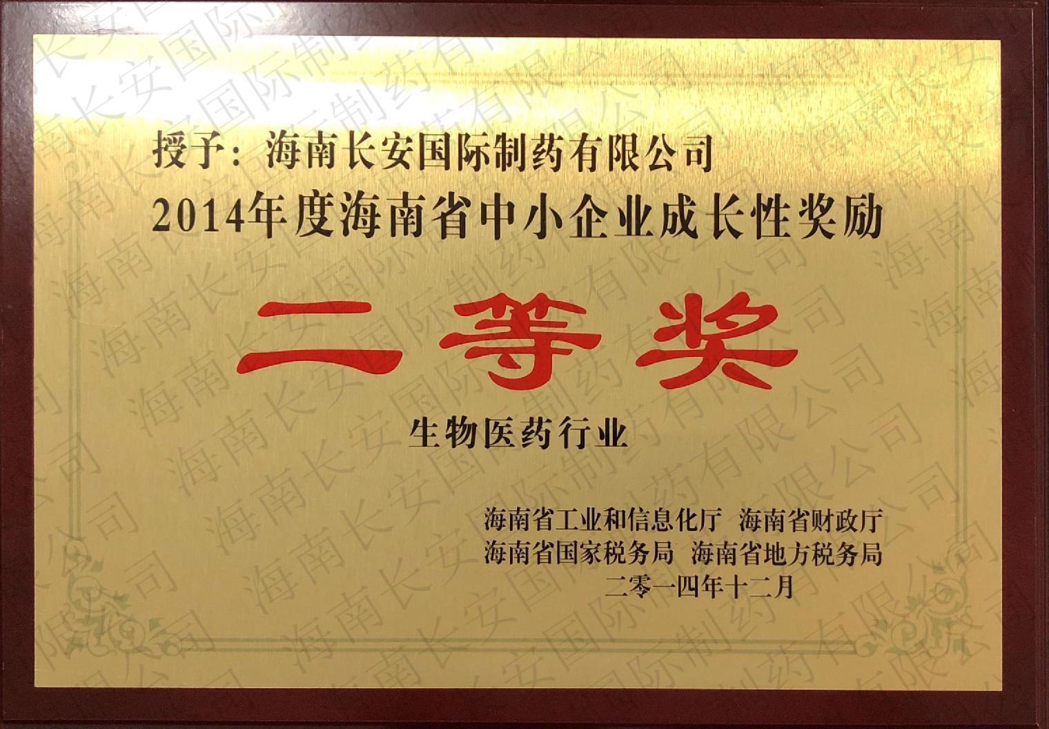 2014年度海南省中小企業成長性獎勵(生物醫藥行業)-二等獎